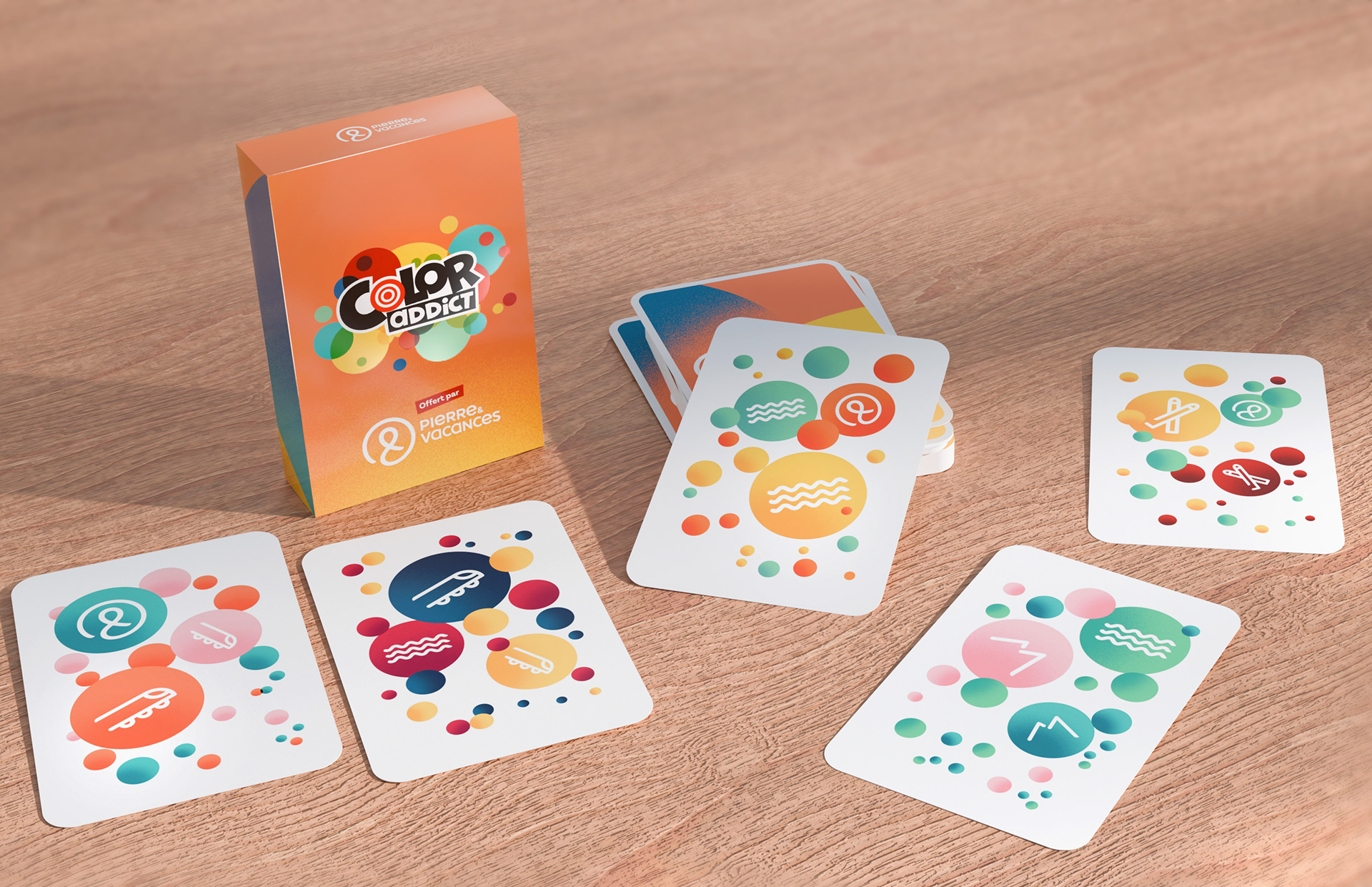 Pour Pierre & Vacances, j’ai eu le plaisir de réaliser l’ensemble des pictogrammes pour un jeu de cartes conçu en partenariat avec le jeu Color Addict.